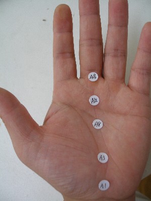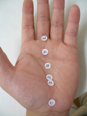 さて、左の写真は女性用の健康管理&元気活性化の処方です。右は男性用。女性と男性との違いはそうですね、掌中央のA8=臍を基準にすると、女性は下に3箇所、男性は2箇所となるところがポイントですね。